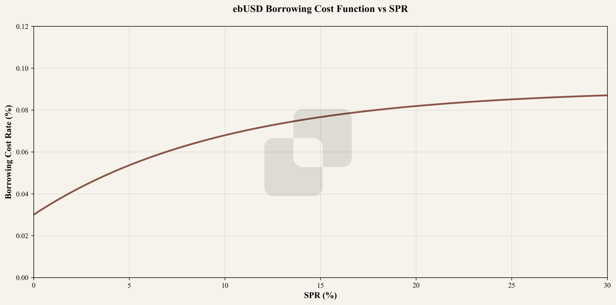 A crucial input is the minimum viable fixed borrow rate on Ebisu, which we derive from the SPR. This is done using an exponential function modelled after the behaviour observed in Liquity V2 since its launch.
