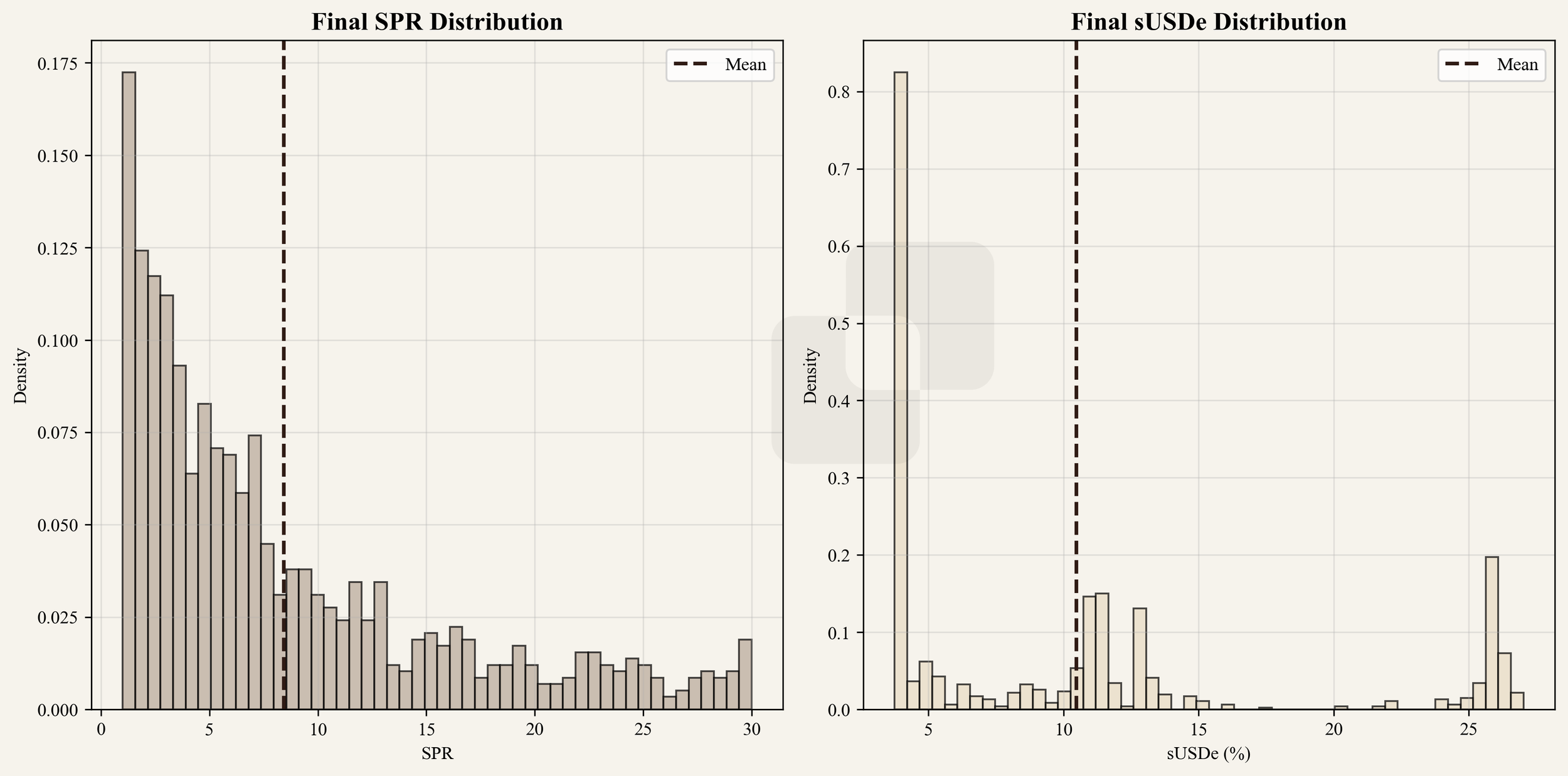 While this is a simplified approach, limited by the relatively short historical record, it provides a reasonable basis for scenario testing. The resulting final distributions for both SPR and sUSDe yields are summarised in the figure below.